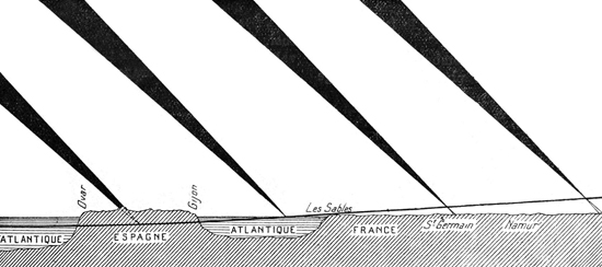 | Fig. 5 - Previsão da trajetória do vértice do cone de sombra da Lua no dia 17 de abril de 1912 |